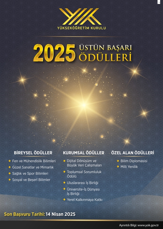 Yükseköğretim Kurulu (YÖK) tarafından Bireysel Ödül, Kurumsal Ödül, Özel Alan Ödülü ve Özel Ödül olmak üzere dört ana başlık altında verilen YÖK Üstün Başarı Ödülleri başvuru süreci 02 Nisan 2025 Çarşamba günü başlayıp 14 Nisan 2025 Pazartesi günü saat 23.59'da son bulacaktır.