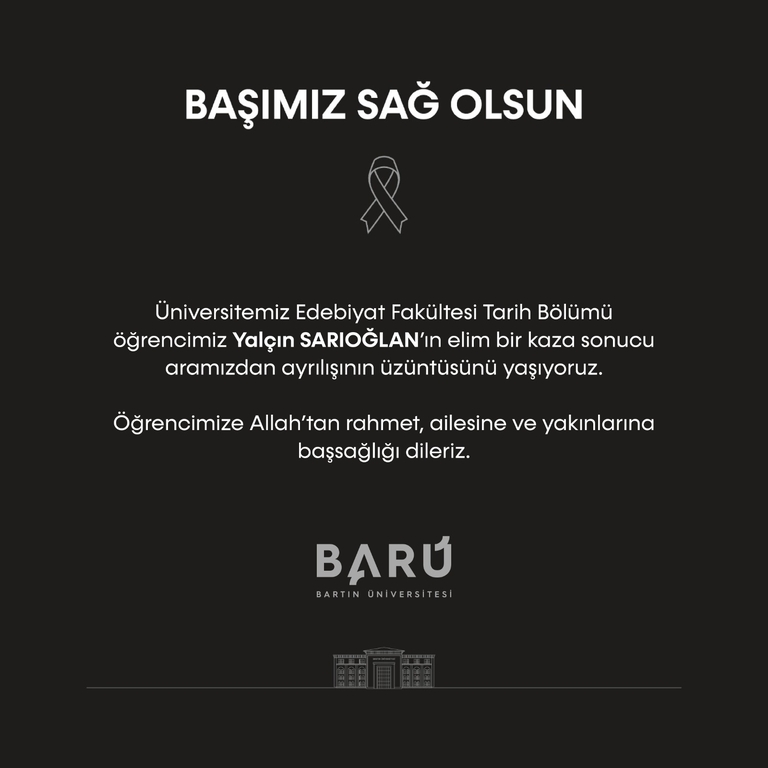 Üniversitemiz Edebiyat Fakültesi Tarih Bölümü öğrencimiz Yalçın SARIOĞLAN’ın elim bir kaza sonucu aramızdan ayrılışının üzüntüsünü yaşıyoruz.
