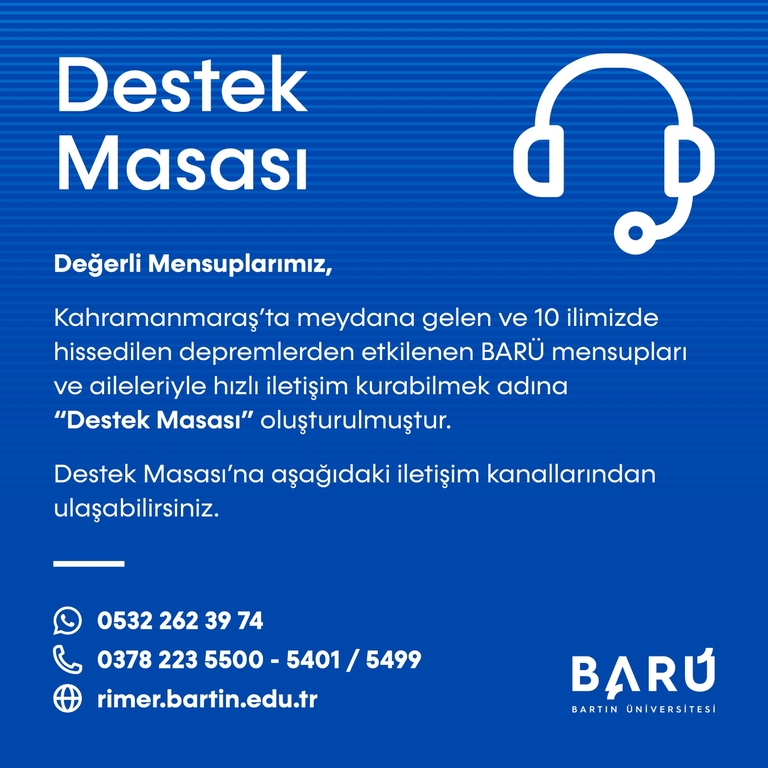 Kahramanmaraş’ta meydana gelen ve 10 ilimizde hissedilen depremlerden etkilenen BARÜ mensupları ve aileleriyle hızlı iletişim kurabilmek adına “Destek Masası” oluşturulmuştur.