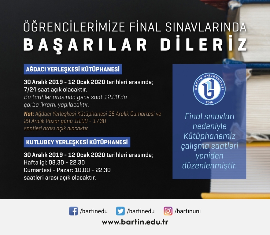 02 Ocak 2020 tarihinde başlayacak olan final sınavları nedeniyle kütüphanemiz çalışma saatleri yeniden düzenlenmiştir;