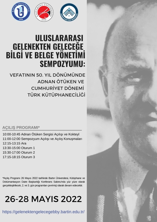Bartın Üniversitesi Edebiyat Fakültesi Bilgi ve Belge Yönetimi Bölümü, Çankırı Karatekin Üniversitesi Bilgi ve Belge Yönetimi Bölümü ve Kastamonu Üniversitesi Bilgi ve Belge Yönetimi Bölümü’nün işbirliğiyle, düzenlenecek olan “Uluslararası Gelenekten Geleceğe Bilgi ve Belge Yönetimi Sempozyumu”nun ilki Bartın Üniversitesi Bilgi ve Belge Yönetimi Bölümü’nün ev sahipliğinde “Vefatının 50. Yıl Dönümünde Adnan Ötüken ve Cumhuriyet Dönemi Türk Kütüphaneciliği” teması ile 26 -28 Mayıs 2022 tarihleri arasında yüz yüze ve çevrim içi (hibrit) olarak gerçekleştirilecektir. Bu kapsamda Sempozyumun ilk günü, 26 Mayıs 2022 Perşembe günü Bartın Üniversitesi Kütüphane ve Dokümantasyon Dairesi Başkanlığı Konferans Salonunda Davetli konuşmacıların katılacağı oturumlar yüz yüze yapılacaktır. Aynı gün Kütüphane Fuaye Alanında “Adnan Ötüken” temalı bir sergi açılışı gerçekleştirilecektir. Sempozyumun 2. ve 3. Günlerinde (27-28 Mayıs 2022) yapılacak oturumları ise çevrimiçi olacaktır.