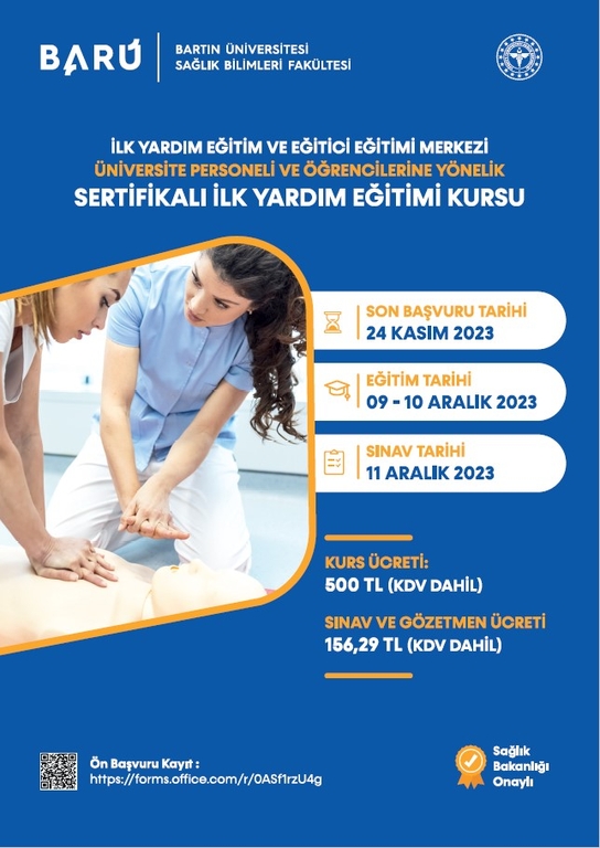 Bartın Üniversitesi Sağlık Bilimleri Fakültesi İlk Yardım Eğitim ve Eğitici Eğitim Merkezi tarafından üniversitemiz personeli ve öğrencilerine yönelik 9-10 Aralık 2023 tarihlerinde İlk Yardım Eğitimi Kursu düzenlenecektir.