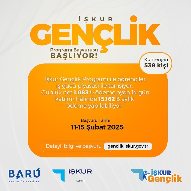 İŞKUR Gençlik Programında BARÜ’de okuyan öğrenciler için 538 kontenjan (522 merkez, 8 Ulus, 8 Kurucaşile) ayrıldı. Programa; hanesine 3 asgari ücretten az gelir giren, 18 yaşını doldurmuş, T.C. uyruklu üniversite öğrencileri başvurabilecek. Öğrenciler, İŞKUR Gençlik Programına 11-15 Şubat 2025 tarihleri arasında genclik.iskur.gov.tr adresinden başvuru yapabilecek. Ayrıca adaylar İŞKUR Gençlik Platformu, İŞKUR Mobil Uygulaması veya ALO 170 İletişim Hattı üzerinden de işlemlerini sürdürebilir.