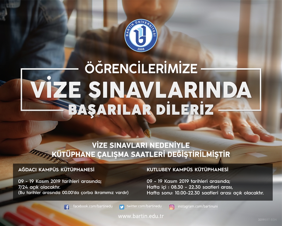 11 Kasım 2019 tarihinde başlayacak olan ara sınavlar nedeniyle Kütüphanemiz çalışma saatleri yeniden düzenlenmiştir. Tüm öğrencilerimize sınavlarda başarılar dileriz 09-19 Kasım 2019 tarihleri arasında AĞDACI KAMPÜS KÜTÜPHANESİ 7/24 saat