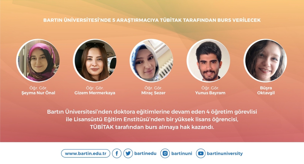 TÜBİTAK Bilim İnsanı Destek Programları Başkanlığı (BİDEB) tarafından yürütülen 2210-Yurt İçi Yüksek Lisans Burs Programları ve 2211-Yurt İçi Doktora Burs Programları 2020 yılı 2. dönem başvuru sonuçları açıklandı. Bu kapsamda Üniversitemiz Sağlık Hizmetleri Meslek Yüksekokulu'ndan Öğr. Gör. Gizem Mermerkaya, Öğr. Gör. Miraç Sezer ve Öğr. Gör. Şeyma Nur Önal ile Bartın Meslek Yüksekokulu'ndan Öğr. Gör. Yunus Bayram 2211/A-Genel Yurt İçi Doktora Burs Programı kapsamında burs almaya hak kazandı. Ayrıca Lisansüstü Eğitim Enstitüsü Makine Mühendisliği Anabilim dalı öğrencisi Büşra Oktavgil’in ise 2210-Yurt İçi Yüksek Lisans Burs Programı kapsamında desteklenmesi uygun görüldü.