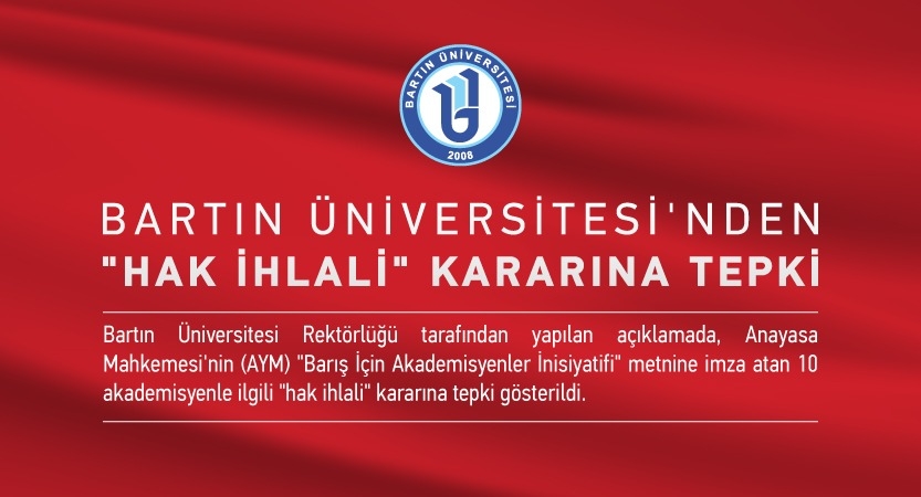 Bartın Üniversitesi Rektörlüğü tarafından yapılan açıklamada, Anayasa Mahkemesi'nin (AYM) "Barış İçin Akademisyenler İnisiyatifi" metnine imza atan 10 akademisyenle ilgili "hak ihlali" kararına tepki gösterildi.