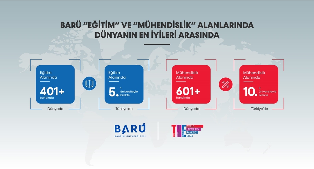 Bartın Üniversitesi (BARÜ) Times Higher Education (THE) 2024 Dünya Üniversiteleri Sıralamasında “Eğitim” alanında dünyada ilk 500, “Mühendislik” alanında ise dünyada ilk 800’de yer aldı. Türkiye’de “Eğitim” alanında ilk 5’e girmeyi başaran BARÜ, “Mühendislik” alanında ise ilk 10’da gösterildi.