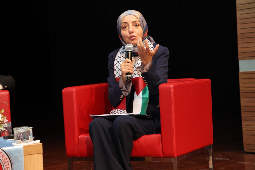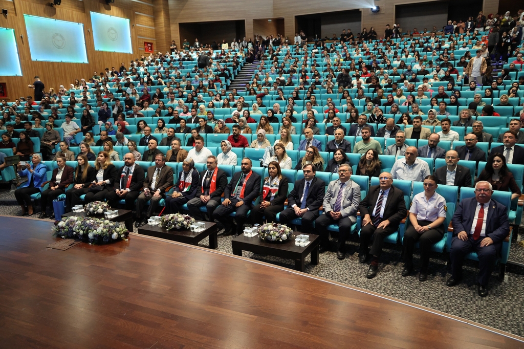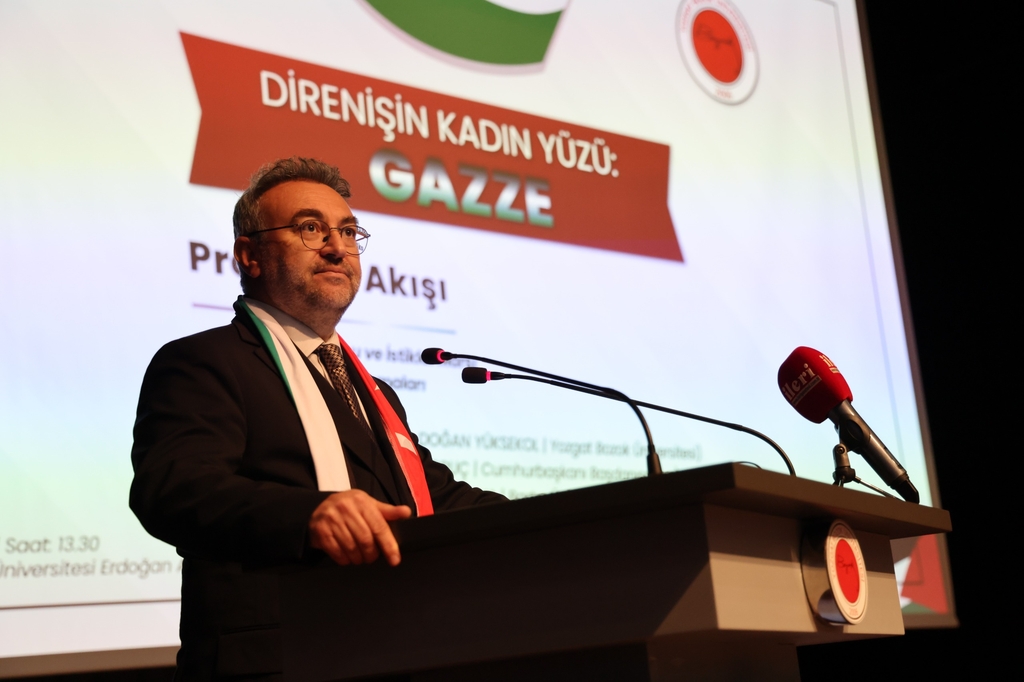 Rektör Prof. Dr. Ahmet Akkaya konuşmasında “Bugün Gazze’de yaşanan insanlık dramını, kadınların onurlu direnişini ve hakikatin sesini hep birlikte hatırlayacağız. Bu imtihan yalnızca Gazze’de ya da Filistin’de yaşayanların değil, Müslümanların ve insanlığın ortak imtihanıdır. Binlerce insanın yurdundan edilmesi ve farklı coğrafyalara göç ettirilmesi, 7 Ekim 2023 itibarıyla çok daha derin bir trajediye dönüşmüştür. Bugün o acı günün üzerinden iki yıl geçti. Kadın, çocuk, yaşlı demeden insanlar hâlâ orada direnişini sürdürüyor, açlık ve yoklukla mücadele ediyor. Bizler ise burada seyirci kalmıyoruz; derslerle, yürüyüşlerle ve boykotlarla Gazze halkının yanında olduğumuzu gösteriyoruz.” dedi.
