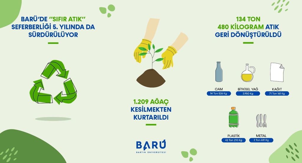 Bartın Üniversitesinde (BARÜ) etkin ve sürdürülebilir bir şekilde yürütülen ‘Sıfır Atık’ uygulamaları ile son 5 yılda 134 ton 480 kilogram atık geri dönüştürülerek 1.209 ağaç kesilmekten kurtarıldı.