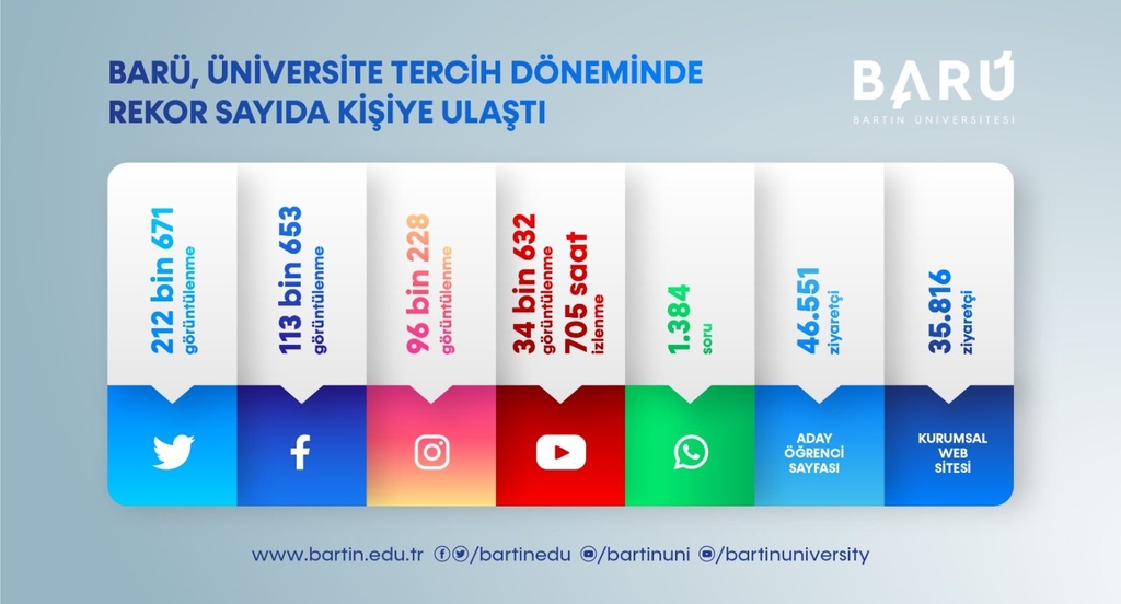 Tercih dönemi öncesi başlayan ve tercih dönemiyle hız kazanan sosyal medya paylaşımlarıyla doğru tercih ve kariyer danışmanlığı noktasında bilgiler verildi. 9 fakülte, 1 yüksekokul, 3 meslek yüksekokulunda yer alan programların eğitim süreci ve istihdam olanakları konularında bilgilendirmelerin yapıldığı paylaşımlar binlerce kişiye ulaştı. Temmuz ayında başlayan 5 ağustosta biten tercihlerin son gününe kadar BARÜ’ye ait resmi hesaplardan Twitter’da 212 bin 671, Facebook’ta 113 bin 653 ve Instagram’da ise 96 bin 228 erişim sağlandı. YouTube’da 34 bin 632 kez tıklanan içerikler 705 saat izlendi. Whatsapp İletişim Hattı’na ise gelen 1.384 soruya ise en hızlı şekilde cevaplar verildi.