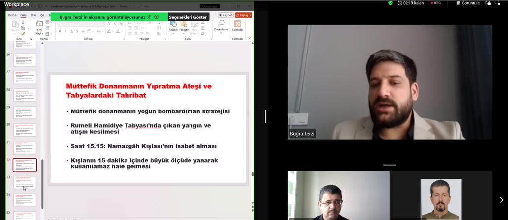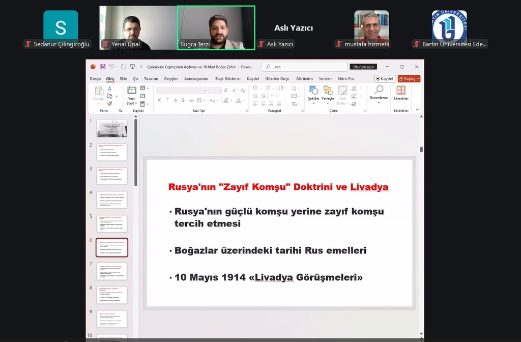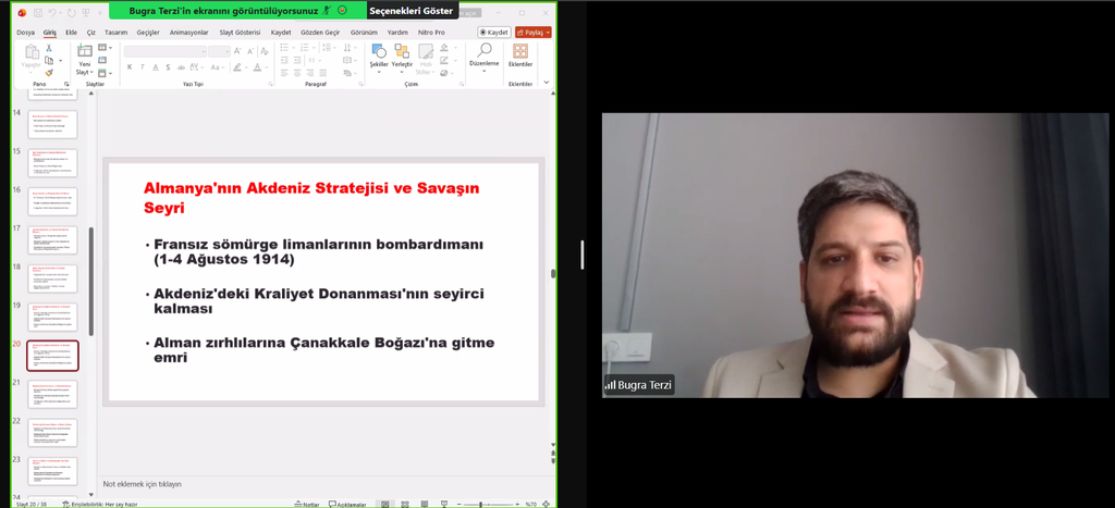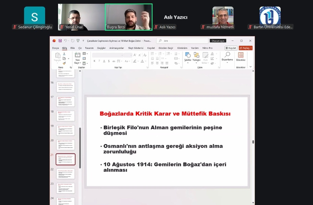 Çanakkale Savaşı’nın deniz ve kara harekâtlarının birlikte yürütüldüğü çok yönlü bir cephe olduğuna değinen Terzi, İtilaf Devletleri’nin ilk olarak Çanakkale Boğazı’nı geçme girişimlerinde bulunduğunu ancak deniz harekâtında başarısız olunması üzerine kara savaşlarına yöneldiklerini aktardı. Sunumda ayrıca savaşın dönüm noktaları hakkında bilgi verilirken özellikle Nusret mayın gemisinin 18 Mart Çanakkale Zaferi’nin kazanılmasında kritik rol oynadığı ifade edildi.