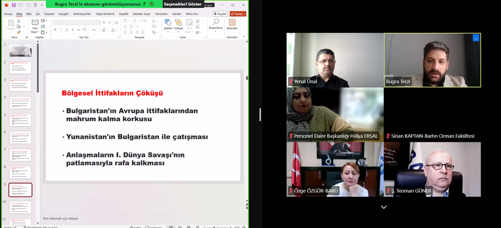 Arş. Gör. Terzi ise sunumunda destansı mücadelenin stratejik, askerî ve tarihî boyutlarını anlattı. Çanakkale cephesinin jeopolitik önemine dikkat çeken Terzi, Osmanlı Devleti’nin özellikle Balkan Savaşları sonrasında yaşadığı güç kaybının müttefik arayışını hızlandırdığını belirtti. Bu süreçte Enver Paşa öncülüğünde gerçekleştirilen reformlar ve Almanya ile kurulan yakın ilişkilerin belirleyici olduğundan bahsetti.