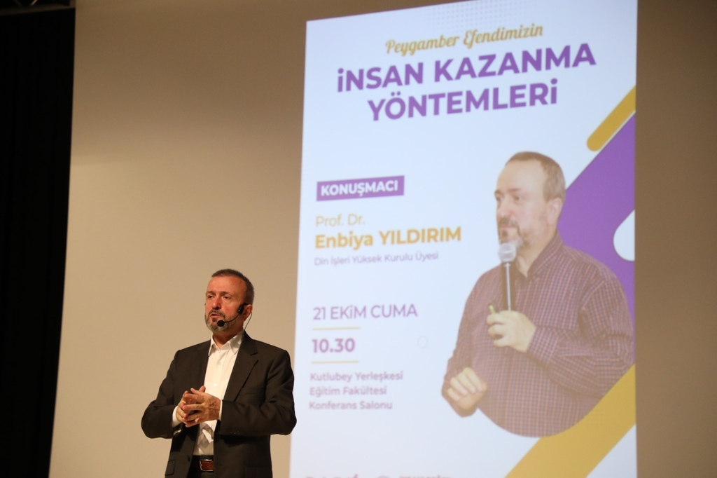 Etkinlikte, Din İşleri Yüksek Kurulu Üyesi Prof. Dr. Enbiya Yıldırım tarafından “Peygamber Efendimizin İnsan Kazanma Yöntemleri” konusunda bilgiler verildi. Kur’an-ı Kerim ile yetinme konusunda düşülen hatalara dikkat çeken Yıldırım, bu gibi düşüncelerden özellikle gençleri korumanın önemli olduğunu söyledi.