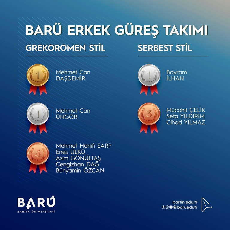 Erkekler grekoromen stilde Mehmet Can Daşdemir 82 kiloda Türkiye şampiyonu olurken 130 kiloda Mehmet Can Üngör gümüş madalya kazandı. Ayrıca Mehmet Hanifi Sarp 60 kiloda, Enes Ülkü 63 kiloda, Asım Gönültaş 72 kiloda, Cengizhan Dağ 77 kiloda, Bünyamin Özcan 87 kiloda Türkiye üçüncüsü olarak bronz madalyaya uzandı. BARÜ’lü güreşçiler elde ettikleri bu sonuçlarla grekoromen stilde takım halinde Türkiye üçüncüsü oldu. Erkekler serbest stilde ise Bayram İlhan 65 kiloda gümüş madalyanın sahibi olurken Mücahit Çelik 125 kiloda, Sefa Yıldırım 70 kiloda, Cihad Yılmaz ise 61 kiloda bronz madalya kazanma başarısı gösterdi. Bu bireysel sonuçlarla BARÜ’lüler serbest stilde takım hâlinde Türkiye beşincisi oldu. BARÜ’lü sporcuların heyecanına antrenörleri Öğr. Gör. Dr. Ömer Akyüz ile kafile sorumlusu Dr. Öğr. Üyesi Gürkan Elçi de ortak oldu.