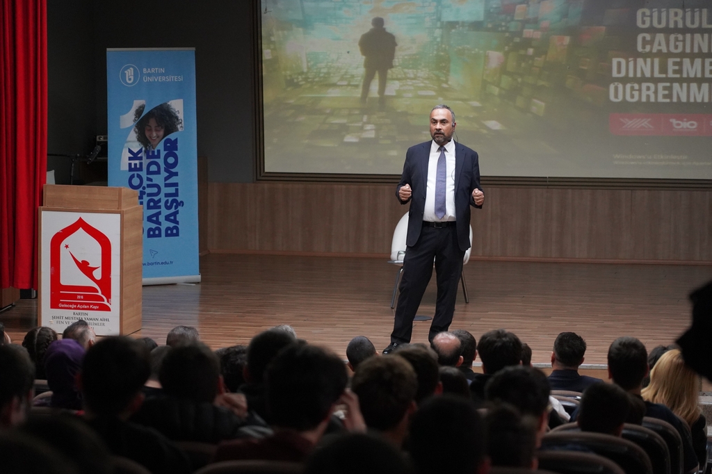 Öğrencilerin yoğun katılımıyla gerçekleştirilen programda Rektör Prof. Dr. Ahmet Akkaya, konuşmasına dinlemenin insan hayatındaki temel yerini anlatarak başladı. Gençlere dinleme becerisi hakkında bilgiler veren Rektör Akkaya, “İlk öğrendiğimiz beceri dinlemedir. Dinlemeden konuşmayı, okumayı ve yazmayı geliştiremeyiz. Eğer iyi bir dinleyici olmazsak iyi bir konuşmacı da olamayız. İnanılmaz bir gürültü çağında yaşıyoruz. 50 yıl önceki gibi hiçbirimiz kuş cıvıltılarının olduğu, ağaçlardaki o muhteşem hışırtı sesiyle karşı karşıya değiliz. Tabiatta değiliz, insanın yapay dünyasındayız. Bizim zamanımızda ders çalışırken bizi uyarıcı nesneler çok yoktu. Ancak bugün sizin çoklu uyaranlarla karşı karşıya olduğunuz gerçeği var.” dedi.