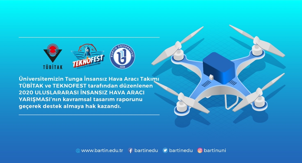 Bartın Üniversitesi Tunga İnsansız Hava Aracı Takımı, TÜBİTAK ve TEKNOFEST tarafından düzenlenen “2020 Uluslararası insansız Hava Aracı Yarışması”nın kavramsal tasarım raporu aşamasını geçerek destek almaya hak kazandı.