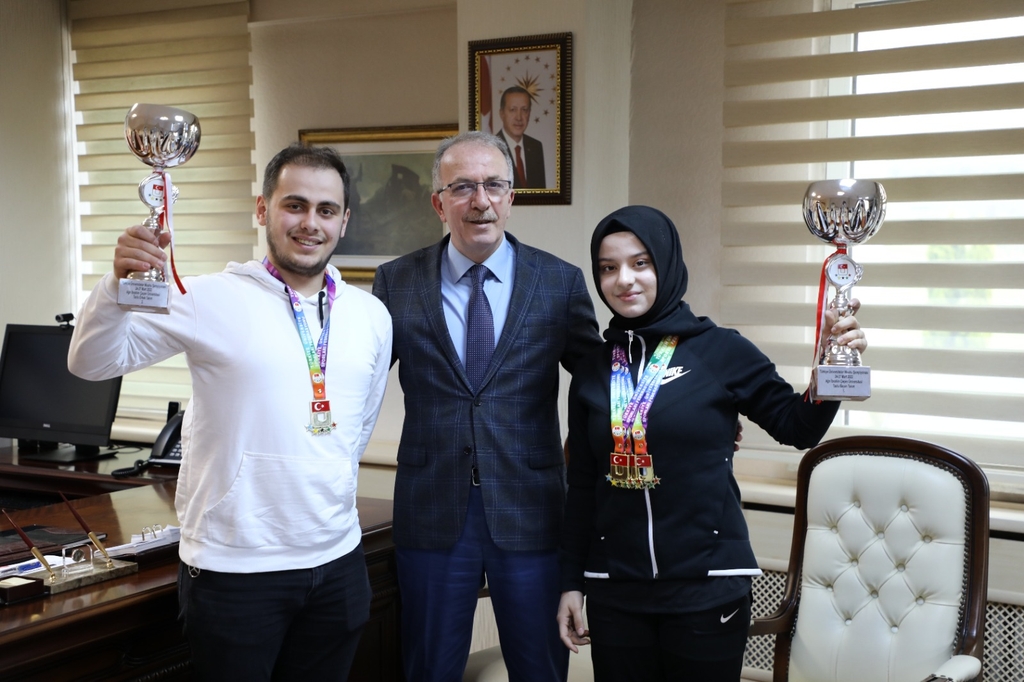 Üniversitemiz Spor Bilimleri Fakültesinin şampiyon sporcuları Zeynep Makbule Akyüz ile Dursun Ali Çapoğlu Rektör Prof. Dr. Orhan Uzun’u ziyaret ettiler.