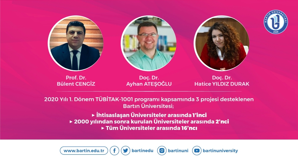 “1001-Bilimsel ve Teknolojik Araştırma Projelerini Destekleme Programı” kapsamında 2020 yılı 1. döneminde Araştırma Destek Programları Başkanlığı’na (ARDEB) önerilen projelerin bilimsel değerlendirme süreci tamamlanarak açıklandı. 1.964 proje önerisinden 1.740’ının bilimsel değerlendirmeye alındığı süreçte 213 projenin desteklenmesi uygun bulundu. Desteklenecek projeler arasında Üniversitemiz öğretim üyeleri Prof. Dr. Bülent Cengiz’in “Bütünleşik Kıyı Planlaması ve Yönetimi Kapsamında Bartın İli İçin Akıllı Turizm ve Rekreasyon Uygulaması Modelinin Geliştirilmesi Üzerine Bir Araştırma”, Doç. Dr. Ayhan Ateşoğlu’nun “Türkiye'nin Dağ Ekosistemi Ekolojik Koşulları, Arazi Kullanımı/Arazi Örtüsü Değişimlerinin İzlenmesi ve İklim Değişikliği Uyum Kapasitelerinin Analizine Yönelik Uzaktan Algılama Tabanlı Bir Algoritmanın Geliştirilmesi” ve Doç. Dr. Hatice Yıldız Durak’ın “Ebeveynlerin Dijital Ebeveynlik Yeterliklerinin Artırılmasına Yönelik Bir Öneri Sisteminin Geliştirilmesi” adlı projeleri de yer aldı.