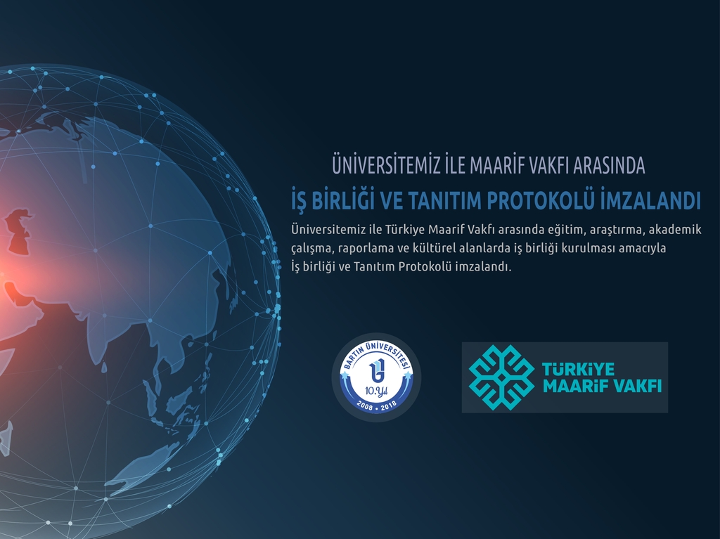 Üniversitemiz Rektörü Prof. Dr. Orhan Uzun ile Türkiye Maarif Vakfı Başkanı Prof. Dr. Birol Akgün tarafından imzalanan ‘İş birliği ve Tanıtım Protokolü’ ile yurtiçi ve yurtdışında yürütülen her türlü eğitim faaliyeti ve bilimsel çalışmalarda ortak hareket edilecek. Ayrıca Bartın Üniversitesi ile Türkiye Maarif Vakfı arasında her türlü bilgi-belge paylaşımı, müfredat materyal temini, yurtdışında bulunan üniversiteler ile ortak programlar, yurtiçi ve yurtdışındaki personel için eğitim çalışmalarına katkı sağlamak gibi konularda da iş birliği yapılacak.