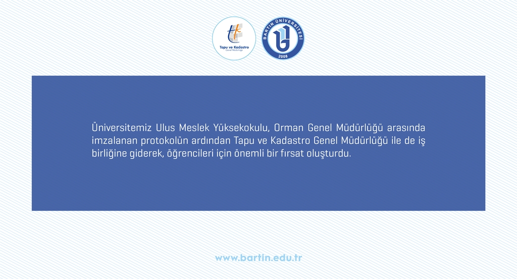 Üniversitemiz Ulus Meslek Yüksekokulu, Orman Genel Müdürlüğü arasında imzalanan protokolün ardından Tapu ve Kadastro Genel Müdürlüğü ile de iş birliğine giderek, öğrencileri için önemli bir fırsat oluşturdu. İmzalanan protokollerle öğrenciler müdürlüklere bağlı tüm birimlerde bir dönem boyunca işyeri eğitimi almalarının önü açıldı.