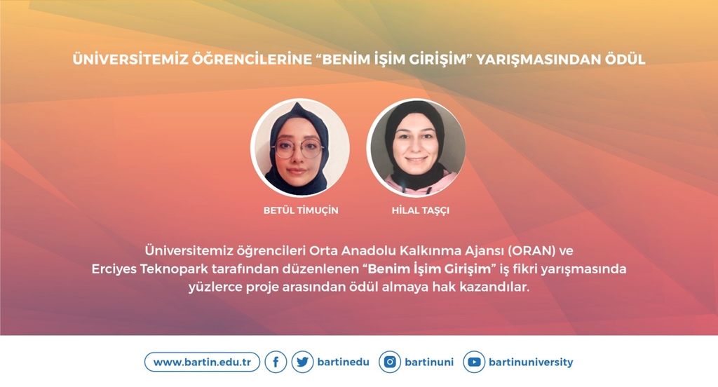 Öğrencileri tebrik eden Üniversitemiz Rektörü Prof. Dr. Orhan Uzun, “Öğrencilerimizi tüm çalışmaların merkezine alarak geleceğimize değer katmaya devam ediyoruz. Bartın Üniversitesi ailesinin en önemli bileşeni olarak gördüğümüz öğrencilerimizi her zaman önceliyor, donanımlı bireyler olmaları için tüm insan kaynağımızla birlikte önemli çaba sarf ediyoruz. Bu düşüncelerle iş fikri yarışmasında elde ettikleri başarılardan dolayı öğrencilerimiz Hilal Taşcı ve Betül Timuçin’i tebrik ediyorum. Ayrıca ‘Üreten Üniversite’ sloganıyla değer üreten ve öğrencilerimizi her daim destekleyen tüm akademik insan kaynağımıza da teşekkür ediyorum” ifadelerini kullandı.