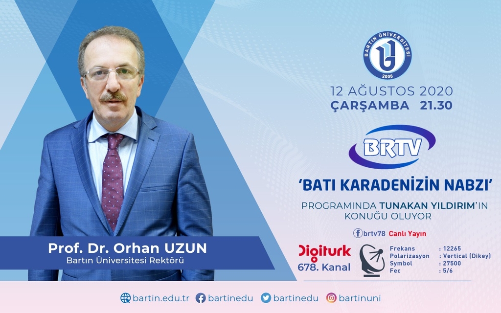 Üniversitemiz Rektörü Prof. Dr. Orhan Uzun, BRTV’de 12 Ağustos 2020 Çarşamba (bu akşam) saat: 21.30’da yayınlanacak ‘Batı Karadenizin Nabzı” programında Gazeteci Tunakan Yıldırım’ın sorularını cevaplandıracak.
