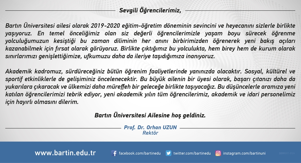 Bartın Üniversitesi ailesi olarak 2019-2020 eğitim-öğretim döneminin sevincini ve heyecanını sizlerle birlikte yaşıyoruz. En temel önceliğimiz olan siz değerli öğrencilerimizle yaşam boyu sürecek öğrenme yolculuğumuzun kesiştiği bu zaman diliminin her anını birbirimizden öğrenerek yeni bakış açıları kazanabilmek için fırsat olarak görüyoruz. Birlikte çıktığımız bu yolculukta, hem birey hem de kurum olarak sınırlarımızı genişleteceğimize, ufkumuzu daha da ileriye taşıdığımıza inanıyoruz.