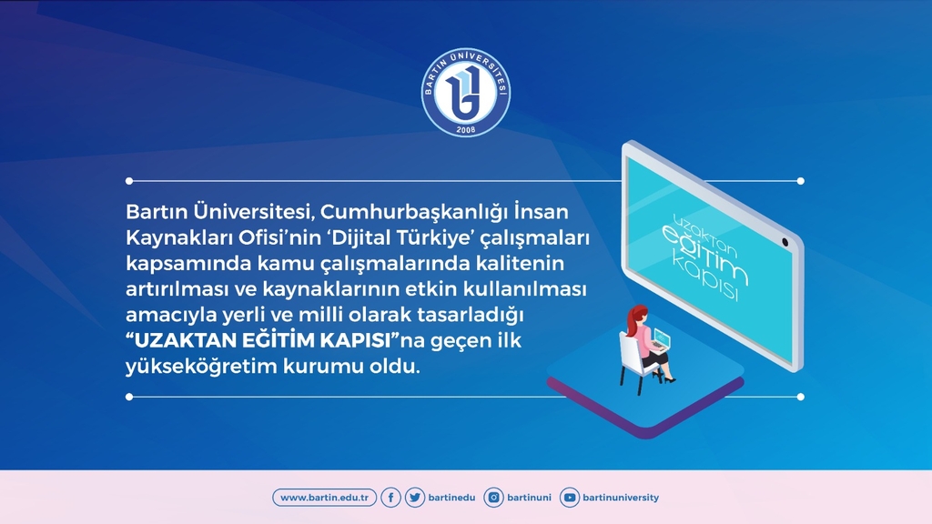 Üniversitemiz, Cumhurbaşkanlığı İnsan Kaynakları Ofisi tarafından, “Eğitim Her Yerde” sloganıyla tüm kamu kurum ve kuruluşlarının hizmetine sunulan “Uzaktan Eğitim Kapısı” çevrimiçi platformunu kullanmaya başladı. Dijital Türkiye çalışmaları kapsamında tamamen yerli ve milli bir yazılım olan “Uzaktan Eğitim Kapısı” ile ilk hizmet içi eğitim Bartın Üniversitesi Personel Daire Başkanlığı tarafından gerçekleştirildi. Personel Daire Başkanı Turgay Delialioğlu tarafından “2547 Sayılı Yükseköğretim Kanunu” hakkında aday memurlara yönelik yapılan eğitimde ilk defa kullanılan online eğitim platformu hakkında da bilgi verildi.