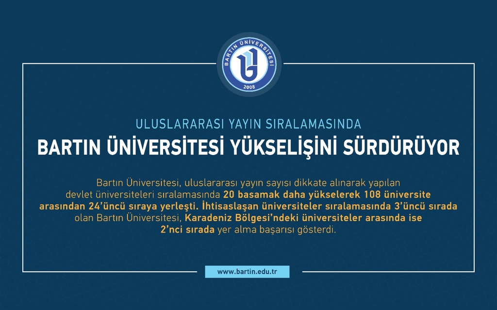 Üniversitemiz, uluslararası yayın sayısı dikkate alınarak yapılan devlet üniversiteleri sıralamasında 20 basamak daha yükselerek 108 üniversite arasından 24’üncü sıraya yerleşti. İhtisaslaşan üniversiteler sıralamasında 3’üncü sırada olan Üniversitemiz, Karadeniz Bölgesi’ndeki üniversiteler arasında ise 2’nci sırada yer alma başarısı gösterdi.
