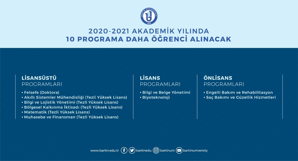 Üniversitemiz tarafından Yükseköğretim Kurulu’na (YÖK) yapılan 9 yeni programın açılmasına ve bir programa ise yeniden öğrenci alımına ilişkin başvuru kabul edildi. Böylece Edebiyat Fakültesi’nde Bilgi ve Belge Yönetimi (40 kontenjan), Sağlık Hizmetleri Meslek Yüksekokulu’nda ise Engelli Bakım ve Rehabilitasyon (40 kontenjan) ile Saç Bakımı ve Güzellik Hizmetleri (30 kontenjan) programına ilk defa öğrenci alınacak. Fen Fakültesi Biyoteknoloji (20 kontenjan) programına ise 2020-2021 Akademik Yılı’nda yeniden öğrenci alınacak.