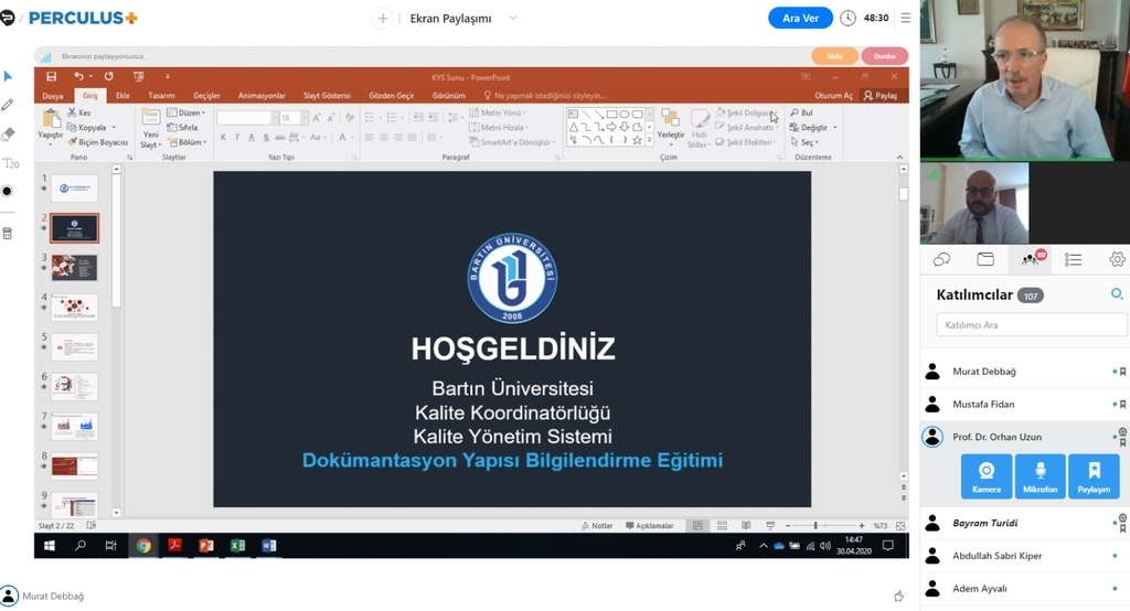 Bu kapsamda ilk online hizmet içi eğitim, Tekniker Bayram Turidi tarafından "Kalite Yönetim Sistemi Dokümantasyon Eğitimi" konusunda verildi. İdari personelin yoğun ilgi gösterdiği online etkinlikte, uygulanan kalite dokümantasyon sistemi hakkında bilgiler veren Turidi, “Dokümanların Toplanması”, “Sınıflandırma”, “Kodlama” ve “Doküman Revizyon Bilgisi” konularını aktararak, “Kalite El Kitabı”nı tanıttı.