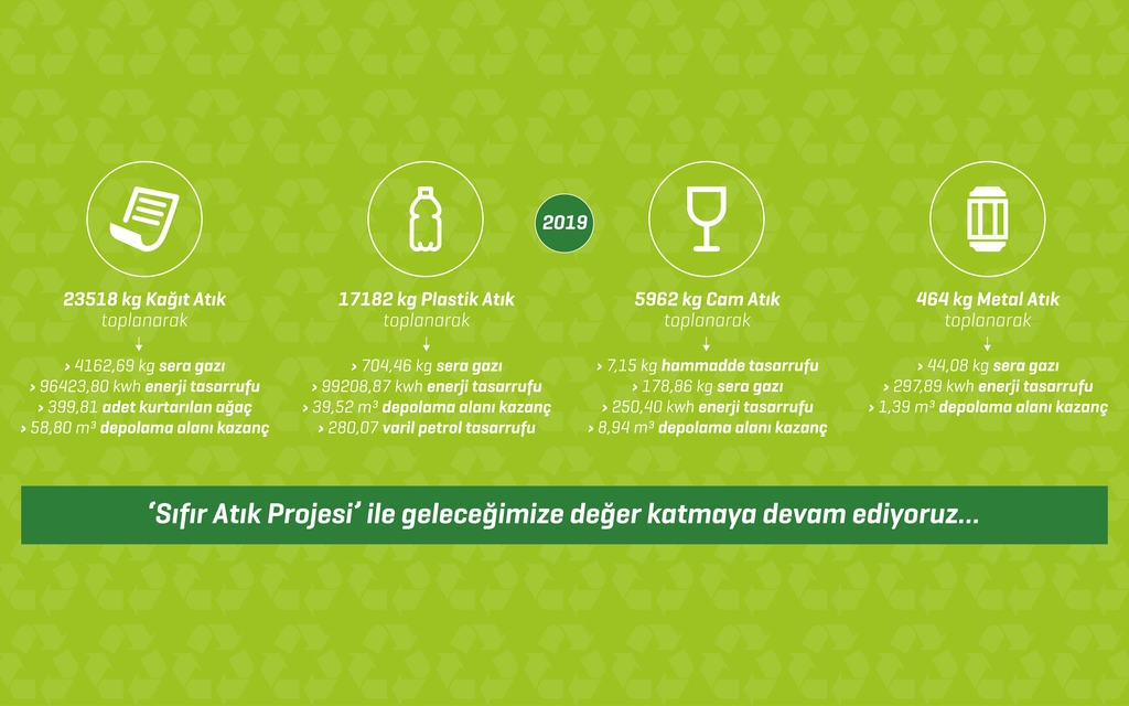 Böylece ‘Sıfır Atık Projesi’ ile 400 ağaç kesilmekten kurtarılırken, 5 bin 90 kilogram sera gazı salınımının önüne geçilmiş oldu. Ayrıca 196 bin 180 kilowatt enerji, 280 varil petrol, 7 kilogram hammadde tasarrufu sağlanırken, 108 metreküp ise depolama alanı kazandırıldı.