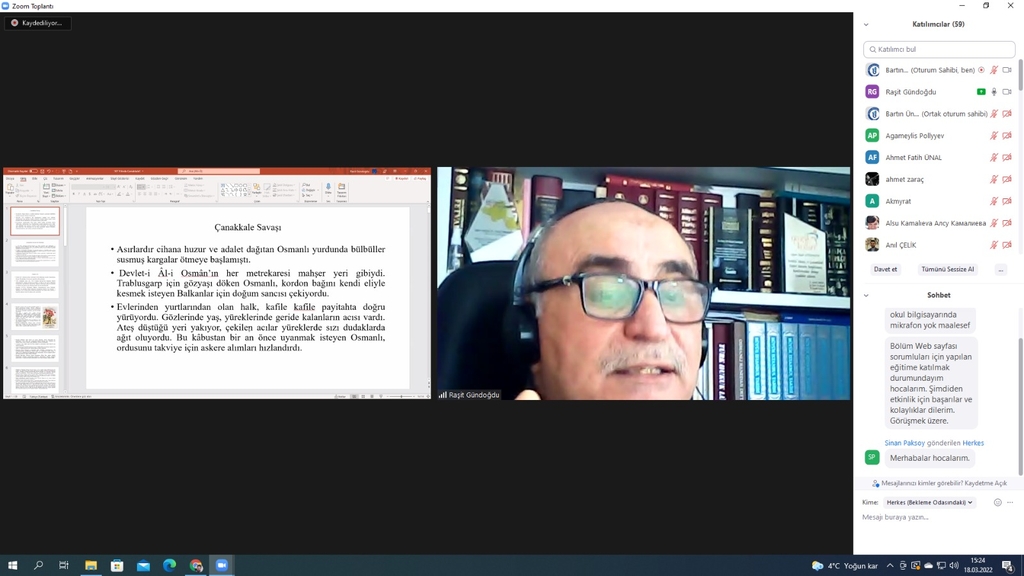 Üniversitemiz Edebiyat Fakültesi Tarih Bölümü tarafından düzenlenen çevrim içi konferans yoğun ilgi gördü. Farklı üniversitelerden katılımcıların da yer aldığı etkinliğin açılışında konuşan Üniversitemiz Rektör Yardımcısı Prof. Dr. Sedat Yazıcı, Çanakkale Savaşı’nın yakın dönem Türk Tarihi ve Türk ulusu için önemi üzerinde durdu.
