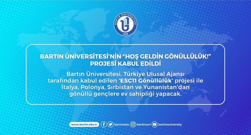 Üniversitemizin 2019 yılında Avrupa Dayanışma Programı kapsamında koordinatör ve ev sahibi kuruluş olarak akredite edilmesinin ardından, ikinci ESC11 Gönüllülük projesi de kabul edildi. Geçtiğimiz yıl hayata geçirilen “Merhaba Gönüllülük!” başlıklı proje ile Yunanistan ile Portekiz’e giden Üniversitemiz öğrencileri ve mezunları yeni projeyle ev sahibi olacaklar. 2020 dönemi için sunulan “Hoş Geldin Gönüllülük!” projesiyle İtalya, Polonya, Sırbistan ve Yunanistan’dan gönüllü gençler Bartın’a gelecekler.