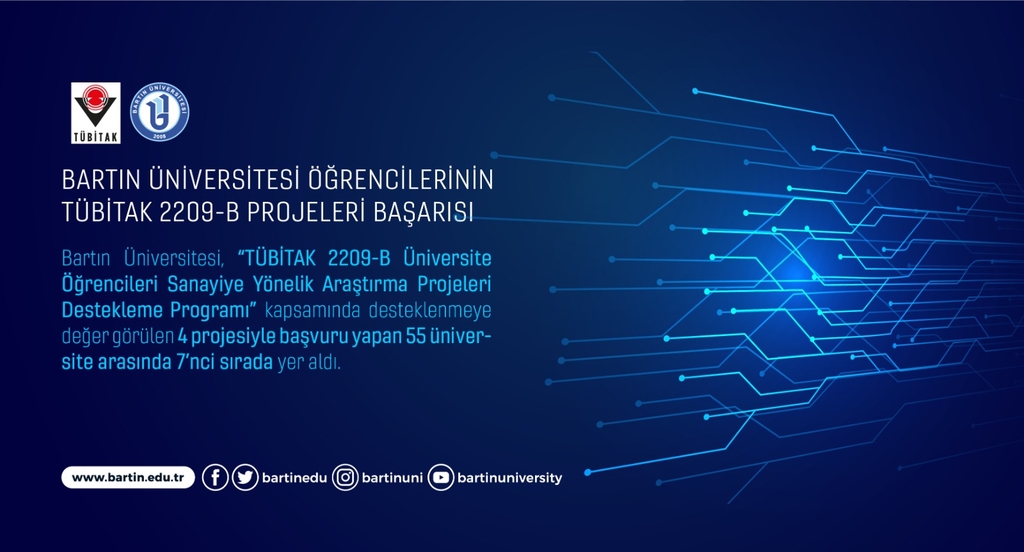 TÜBİTAK’ın teknolojik dönüşümün sağlanması ve değer zincirinde istenilen seviyelere ulaşılması için alanlarında başarılı öğrencileri desteklediği, üniversite-sanayi iş birliğini geliştirmek ve yeni teknolojilere öğrencilerin erişimini sağlamak amacıyla çağrıya çıktığı “TÜBİTAK 2209-B “Üniversite Öğrencileri Sanayiye Yönelik Araştırma Projeleri Destekleme Programı” başvuru sonuçları açıklandı. Yapılan değerlendirmenin ardından TÜBİTAK 2209-A Üniversite Öğrencileri Araştırma Projeleri Destek Program kapsamında 2019 yılı ikinci döneminde 32 projeyle Türkiye 5’incisi, 2020 yılı birinci döneminde 27 projeyle Türkiye 2’ncisi ve 2020 yılı ikinci döneminde ise 58 projeyle Türkiye 4’üncüsü olan Üniversitemizde sunulan 7 projeden 4’ü desteklenmeye değer bulundu. Bartın Üniversitesi başvuru yapan 55 üniversite arasında kabul olan proje sayısına göre 7’nci sırayı 4 üniversite ile birlikte paylaştı.